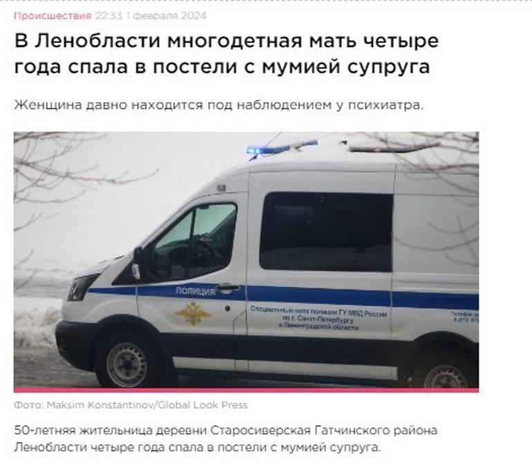 Rus basınında yer alan haberlere nazaran, kimliği yalnızca Svetlana olarak açıklanan 50 yaşındaki bayan, ölmüş kocasının kalıntılarıyla tıpkı yatağı paylaştı ve çocuklarının bu durumdan rastgele birine bahsetmesini yasakladı.