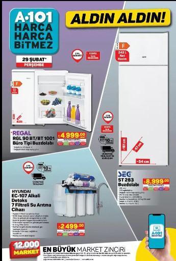 A101 aktüel kataloğu alışveriş tutkunlarının beğenisine sunuldu. A101 kataloğu içerisinde bu perşembe; Regal Ofis Tipi Buzdolabı 4.999 TL, Hyundai Alkali Detoks 7 Filtreli Su Arıtma Aygıtı 2.499 TL, SEG Buzdolabı 8.999 TL’den satışta olacak. Pekala, a101’de bu hafta neler var? İşte, a101 aktüel 29 Şubat 2024 kataloğu…
