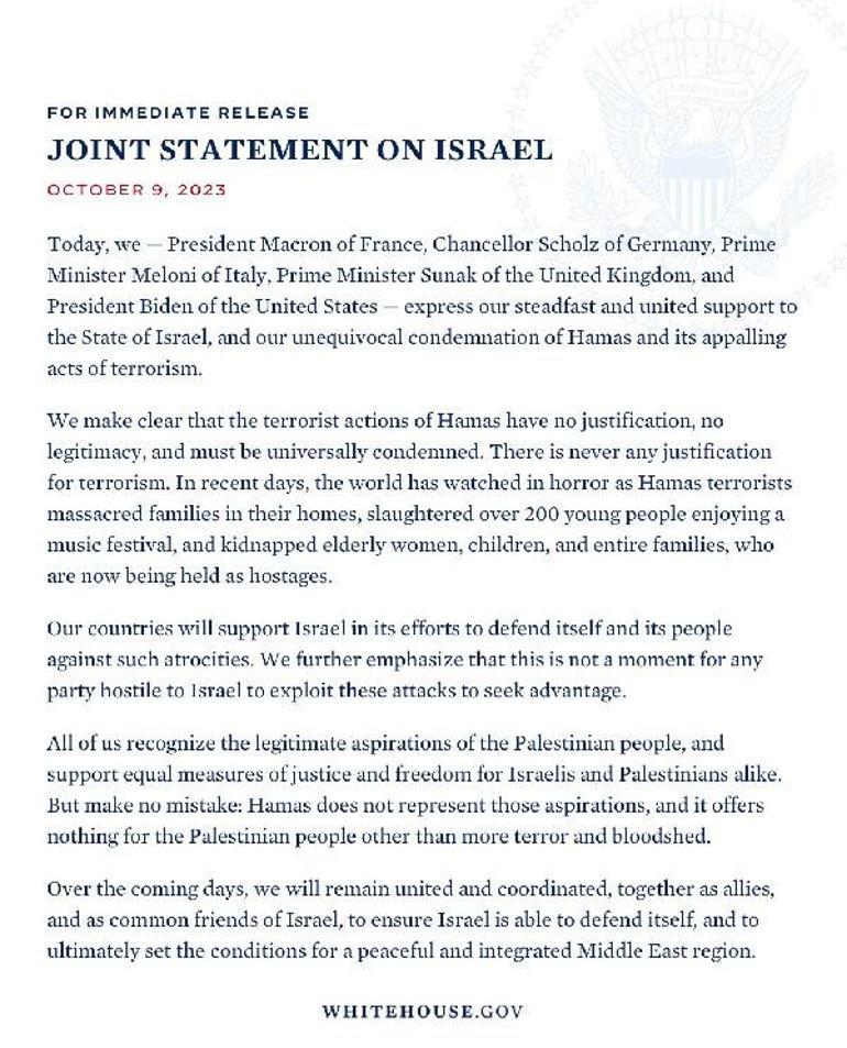 ABD Lideri Joe Biden, Fransa Cumhurbaşkanı Emmanuel Macron, Almanya Şansölyesi Olaf Scholz, İtalya Başbakanı Giorgia Meloni ve İngilitere Başbakanı Rishi Sunak, dün ortak bir açıklama yaptı. Biden ve Macron tarafından paylaşılan açıklamada şu sözler yer aldı;