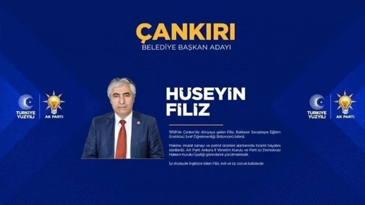 Çankırı’da AK Parti’nin 31 Mart lokal seçimlerine hangi isimle gireceği açıklandı. AK Parti Çankırı Belediye Lider Adayı Hüseyin Filiz oldu.