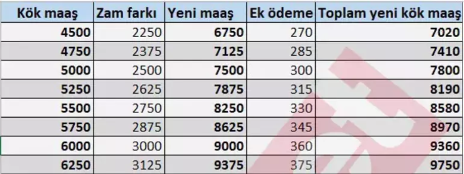 Kök maaşı 5000 lira olan bir emekliye yüzde 50 oranında artırım yapılırsa 2500 liralık artırım farkı doğmuş oluyor. Bunun üzerine yüzde 4 ek ödeme de verilince kök maaş 7800 liraya ulaşıyor. En düşük emekli maaşına yüzde 50 artırım yapılırsa kök maaşı 5 bin lira olan emekli 11 bin 250 lira almış olacak.