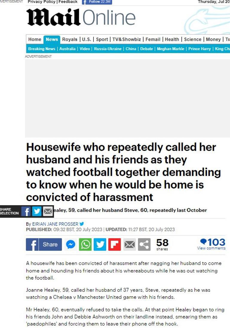 60 yaşındaki Steve Healey arkadaşlarıyla Chelsea-Manchester United maçını izliyordu. Fakat karısı Joanne onu daima arayarak ne vakit konuta geleceğini soruyordu.