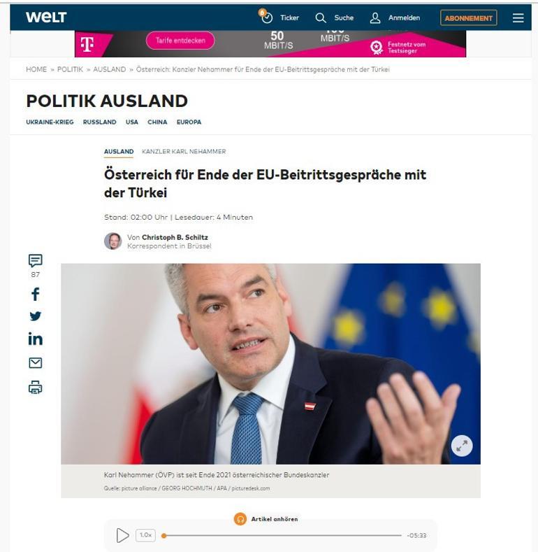 Alman Welt gazetesine konuşan Avusturya Şansölye Karl Nehammer “Ankara ve Brüksel ortasında daha fazla yakınlaşmadan yanayız, fakat Türkiye’nin AB’ye tam üyeliğini hayal edemiyoruz” tabirlerini kullandı.