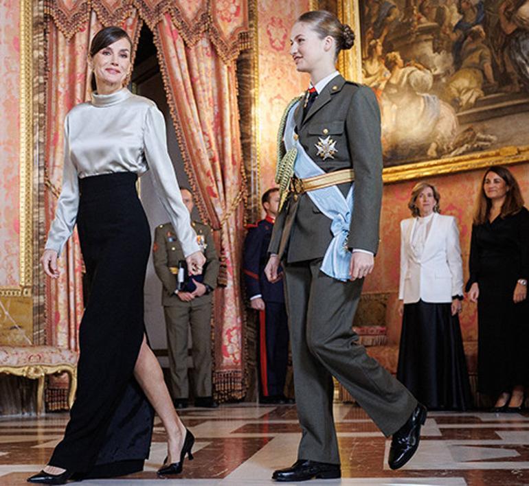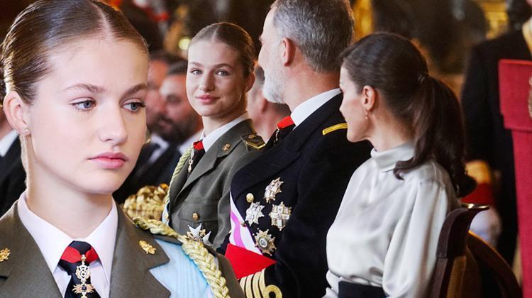 Kral Felipe ve Kraliçe Letizia’nın yanı sıra merasimde birinci sefer Leonor da mesken sahipliği yaptı. Genç kız tıpkı babası üzere askeri üniforması içindeydi.