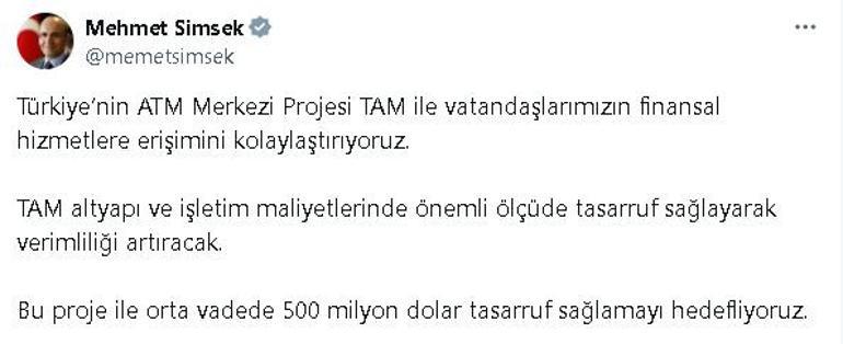 Bakan Şimşek, 2023 yılında uygulamaya alınan TAM Projesi’ne ait, toplumsal medya hesabından açıklama yaptı. Proje ile vatandaşların finansal hizmetlere erişiminin kolaylaştırıldığını belirten Şimşek, “TAM altyapı ve işletim maliyetlerinde değerli ölçüde tasarruf sağlayarak verimliliği artıracak. Bu proje ile orta vadede 500 milyon tasarruf sağlamayı hedefliyoruz” dedi. TAM Projesi kapsamında, kamu ve kamu iştirak bankalarının ATM idaresi için yazılım geliştirme, lisanslama, saha hizmetleri, ATM operasyonları üzere maliyetleri ortaklaştırılarak tek merkezden yönetilecek. Bu sayede bankaların ATM masraflarında tasarruf sağlanacak.