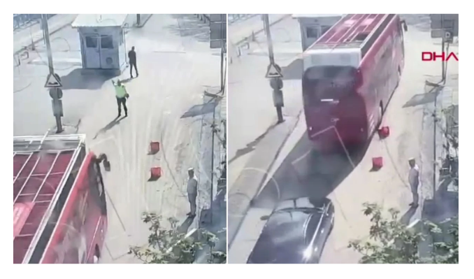 Olaya ilişkin kamera kayıtlarında, polis memurunun şoföre durması için elini kaldırdığı ancak şoförün bu ihtara uymayarak otobüsü polisin üzerine sürdüğü görülüyor.