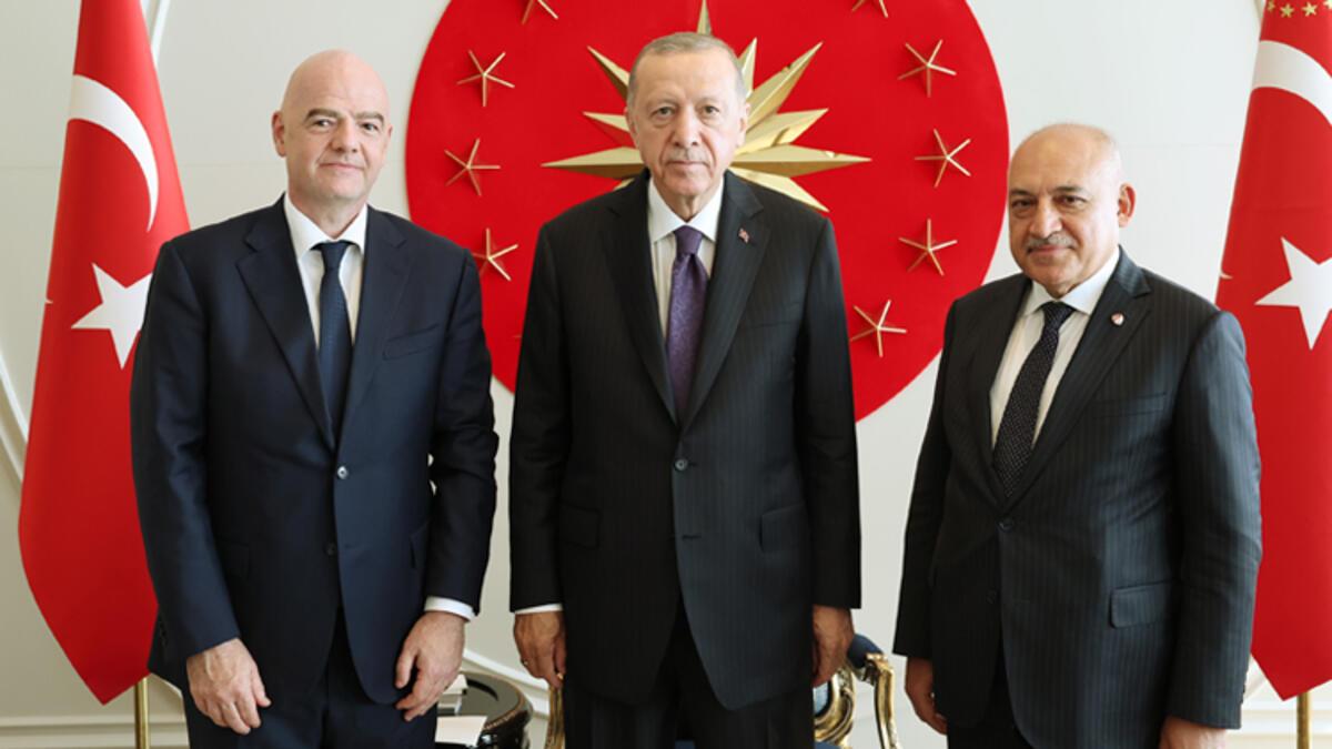 Öte yandan görüşmede FIFA Lideri Gianni Infantino, Cumhurbaşkanı Erdoğan’a forma ve kaptanlık pazubandı ikram etti.
