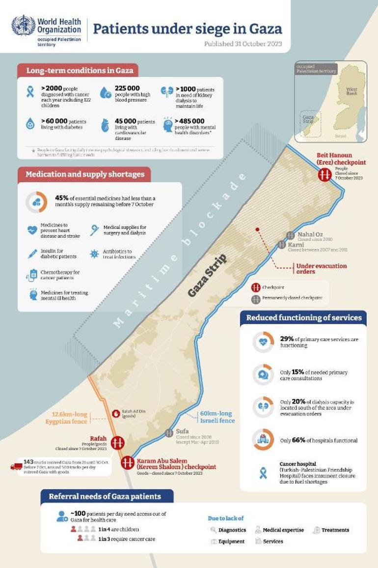Grafikte yer alan datalara nazaran, Gazze’de her yıl sıhhat hizmetlerine erişmesi gereken 122’si çocuk olmak üzere 2 bin kanser hastası,1000 böbrek hastası, 60 bin şeker hastası, 45 bin akciğer hastası ve 485 bin ruh sıhhati sorunu yaşayan hastanın olduğu belirtti. Gazze’de akın öncesinde sıhhat hizmetine erişimin halihazırda sıkıntı olduğunu ve her gün 100 hastanın Gazze dışından sıhhat hizmeti alabildiğini vurgulayan DSÖ, ataklarla birlikte bu imkanın ortadan kalktığını kaydetti.