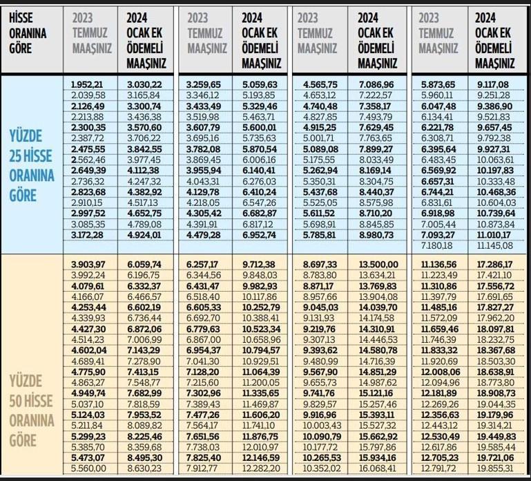 Benzer biçimde 2023’ün Temmuz ayında yüzde 50 paya nazaran 2.500 TL yetim aylığı alanın, yüzde 49.25 artırımla maaşı 2024 Ocak ayında 3.731 TL’ye çıkacak; fakat yüzde 50 paya nazaran en düşük maaş 5.000 TL’den az olamayacağı için, Ocak ayında 5.000 TL maaş yatırılacak. 2024 Ocak ayında yüzde 25 pay oranına nazaran en düşük dul ve yetim aylığı ek ödeme dahil 3.000 TL’ye çıkacak.