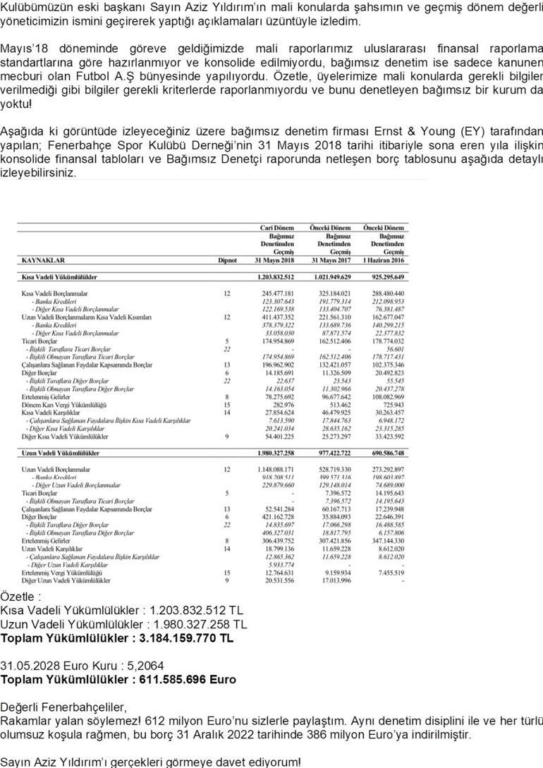 Bilecik’in “Sayın Aziz Yıldırım’ı gerçekleri görmeye davet ediyorum” başlığı ile yaptığı açıklama şöyle: “Kulübümüzün eski lideri Sayın Aziz Yıldırım’ın mali mevzularda şahsımın ve geçmiş periyot pahalı yöneticimizin ismini geçirerek yaptığı açıklamaları ıstırapla izledim. Mayıs ‘18 devrinde misyona geldiğimizde mali raporlarımız memleketler arası finansal raporlama standartlarına nazaran hazırlanıyor ve konsolide edilmiyordu. Bağımsız kontrol ise yalnızca kanunen mecburi olan Futbol A.Ş. bünyesinde yapılıyordu. Özetle, üyelerimize mali hususlarda gerekli bilgiler verilmediği üzere gerekli kriterlerde raporlanmıyordu ve bunu denetleyen bağımsız bir kurum da yoktu. Aşağıdaki manzarada izleyeceğiniz üzere bağımsız kontrol firması Ernst&Young (EY) tarafından yapılan; Fenerbahçe Spor Kulübü Derneği’nin 31 Mayıs 2018 tarihi prestijiyle sona eren yıla ait konsolide finansal tabloları ve Bağımsız Denetçi raporunda netleşen borç tablosunu aşağıda ayrıntılı inceleyebilirsiniz.