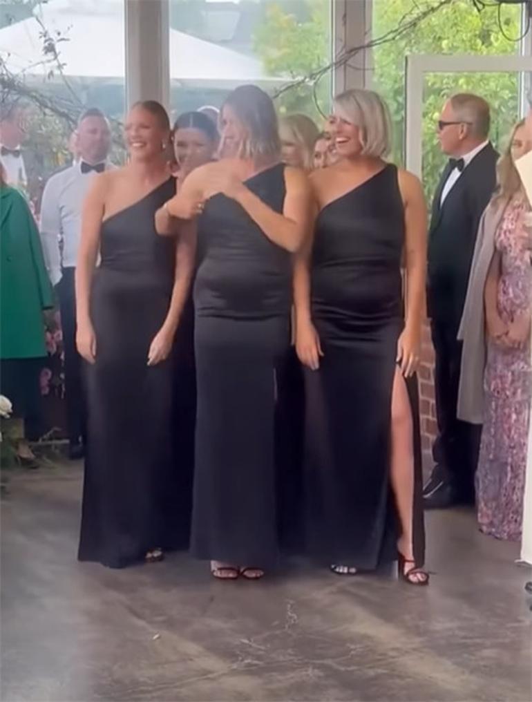 Gelinin nedimeleri merasimde siyah giydi. Sevinçli genç bayanlar salona dans ederek girdi.