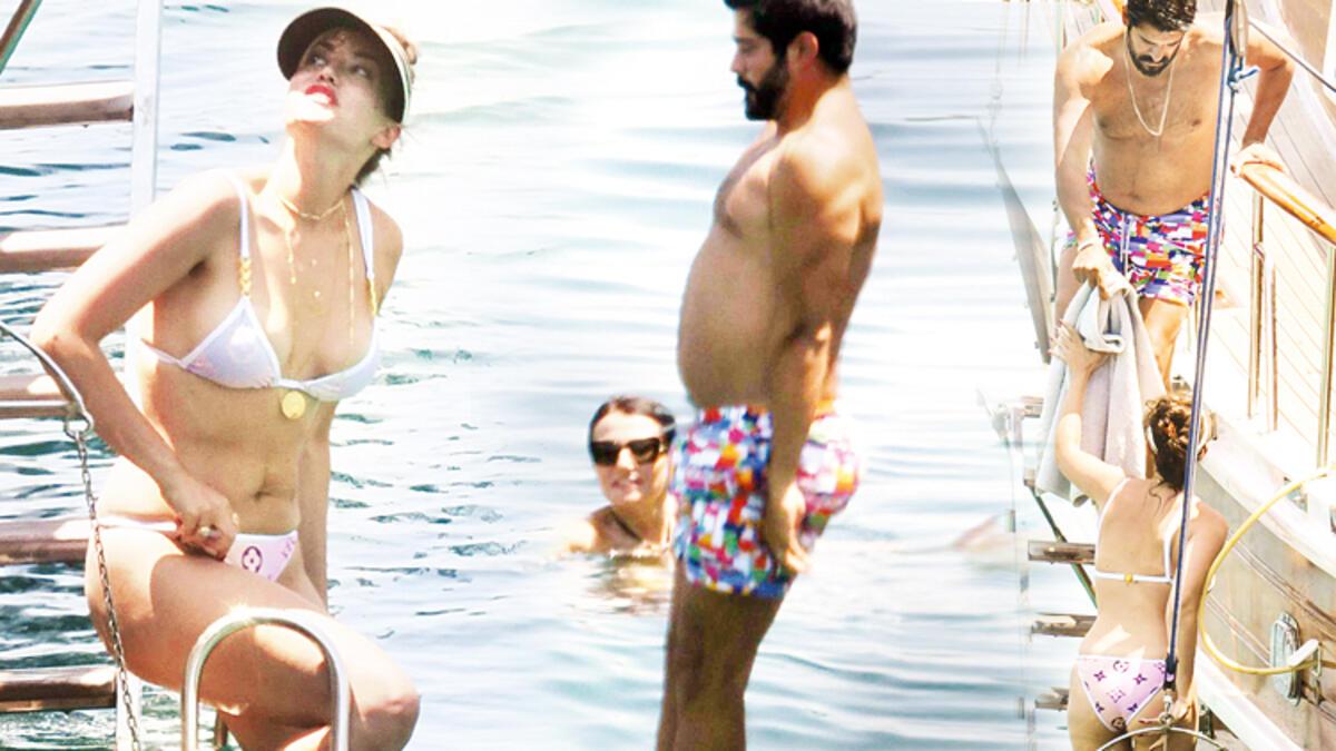 Kahvaltının akabinde denize birinci giren Fahriye Evcen oldu. Eşinin akabinde teknenin art kısmından kendisini serin sulara bırakan Burak Özçivit’in göbekli halleri objektiflere bu türlü yansıdı.