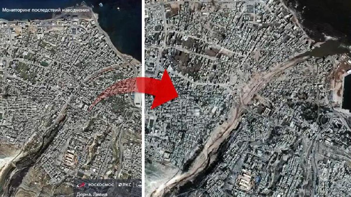 “Kanopus-V uzay aracından alınan imaj, Libya’nın Derne kentinde meydana gelen feci sel felaketinin sonuçlarını gösteriyor. Akdeniz kasırgası Daniel, 10 Eylül’de ülkenin doğusunda tesirli oldu ve bu bölgelerde son derece az görülen şiddetli yağışları beraberinde getirdi.