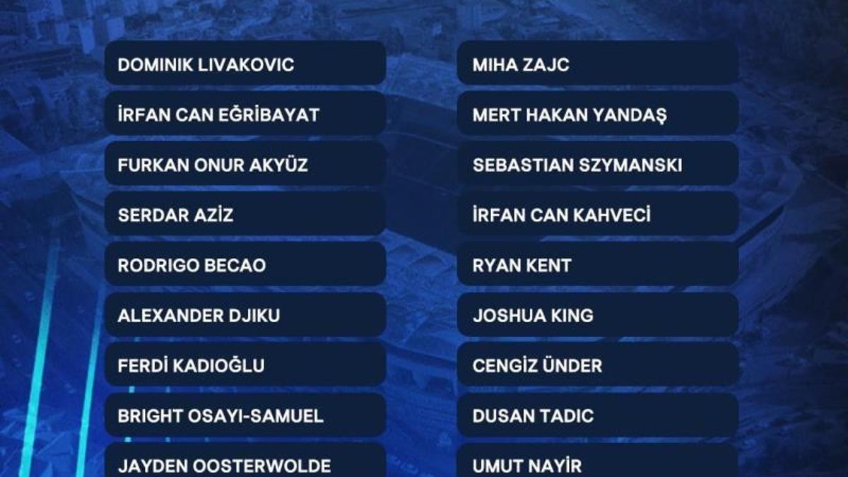 “Dominik Livakovic, İrfan Can Eğribayat, Furkan Onur Akyüz, Serdar Aziz, Rodrigo Becao, Alexander Djiku, Ferdi Kadıoğlu, Bright Osayi-Samuel, Jayden Oosterwolde, Miguel Crespo, İsmail Yüksek, Fred, Miha Zajc, Mert Hakan Yandaş, Sebastian Szymanski, İrfan Can Kahveci, Ryan Kent, Joshua King, Cengiz Ünder, Dusan Tadic, Umut Nayir, Michy Batshuayi, Edin Dzeko.”