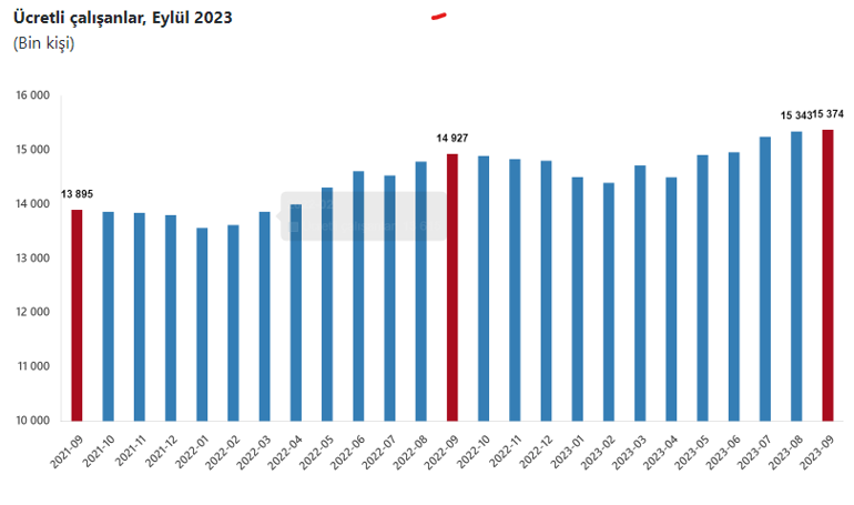 Sanayi, inşaat ve ticaret-hizmet kesimleri toplamında fiyatlı çalışan sayısı 2023 Eylül ayında bir evvelki yılın tıpkı ayına nazaran %3,0 arttı. Fiyatlı çalışan sayısı bir evvelki yılın birebir ayında 14 milyon 926 bin 919 kişi iken, 2023 yılı Eylül ayında 15 milyon 374 bin 379 kişi oldu.