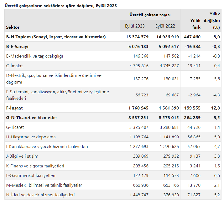 Ücretli çalışanların alt ayrıntılarına bakıldığında; 2023 Eylül ayında fiyatlı çalışan sayısı yıllık olarak sanayi bölümünde %0,3 azaldı, inşaat bölümünde %12,8 arttı ve ticaret-hizmet dalında %3,2 arttı.