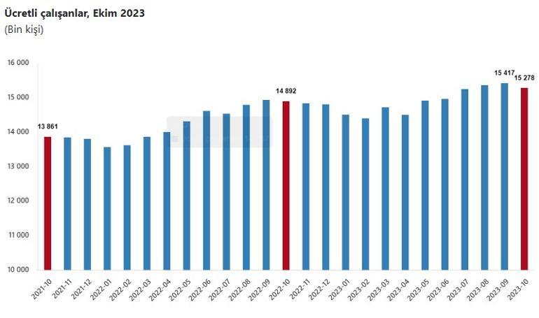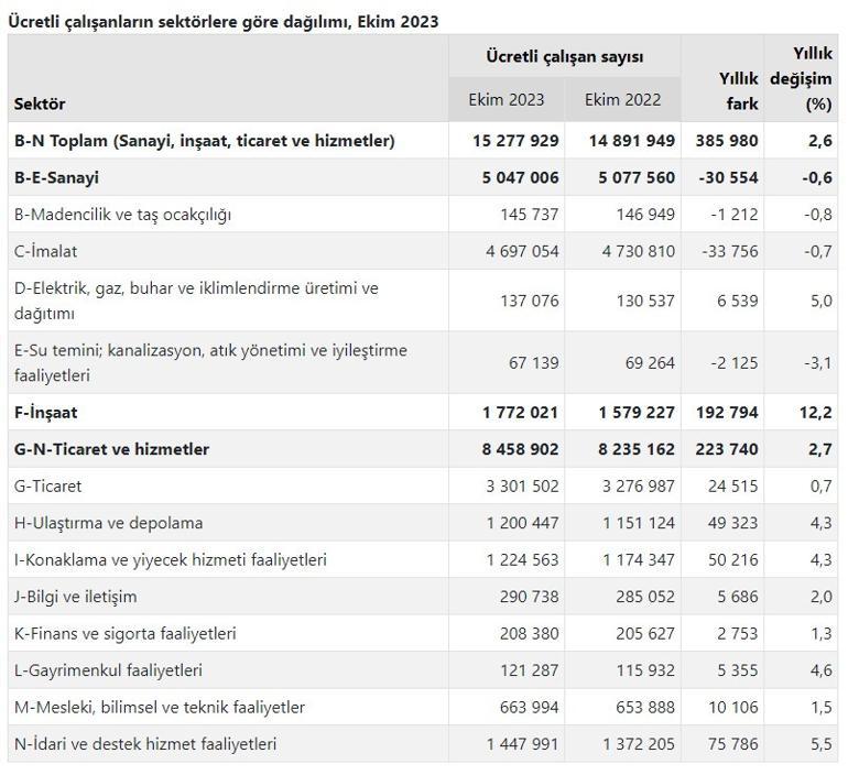 Ücretli çalışanların alt ayrıntılarına bakıldığında; 2023 Ekim ayında fiyatlı çalışan sayısı yıllık olarak sanayi kesiminde %0,6 azaldı, inşaat bölümünde %12,2 arttı ve ticaret-hizmet dalında %2,7 arttı.