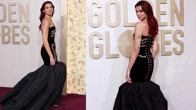 Dua Lipa’nın Altın Küre merasimi için seçtiği altın işlemeli Schiaparelli elbisesi gecenin en şık görünümlerinden biriydi… İngiliz yıldız kırmızı halının en beğenilen isimlerinden oldu