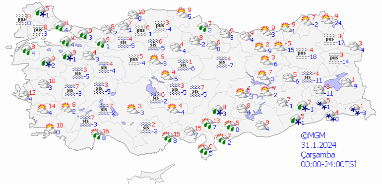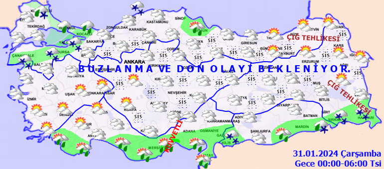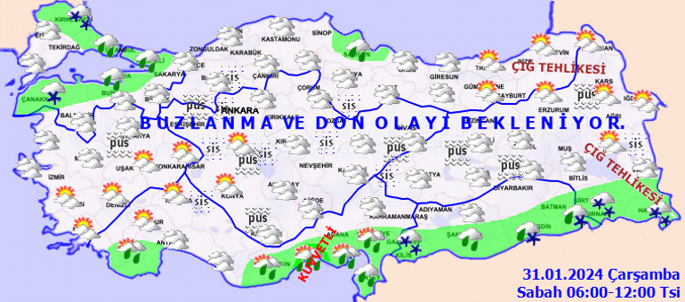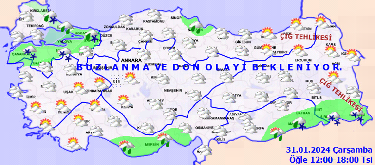 Meteoroloji Genel Müdürlüğü olarak yapılan son değerlendirmelere nazaran, ülkemiz genelinin modüllü ve çok bulutlu, Akdeniz Bölgesi, İstanbul, Sinop ve Samsun etraflarının yağmurlu, Marmara’nın güney ve doğusu, Akdeniz’in iç bölümleri, Güneydoğu Anadolu (Diyarbakır haric) ile Kırklareli, Hakkari ve Şırnak etraflarının karla karışık yağmur ve kar yağışlı geçeceği varsayım ediliyor. Yağışların Mersinin doğusunda yer yer kuvvetli olması bekleniyor. Rüzgarın; Marmara, Kıyı Ege ve Doğu Akdeniz’de kuzey ve kuzeydoğu istikametlerden kuvvetli ve kısa müddetli fırtına (40-80 km/saat) formunda esmesi bekleniyor. Gece ve sabah saatlerinde iç ve doğu bölgelerde yer yer pus ve sis ile birlikte buzlanma ve don olayı bekleniyor. Doğu Karadeniz’in iç kesitleri ile Doğu Anadolu’nun kuzey ve doğusunda çığ tehlikesi bulunmaktadır.