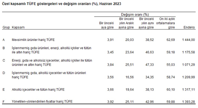 İşlenmemiş besin eserleri, güç, alkollü içkiler ve tütün ile hariç TÜFE’deki değişim, 2023 yılı Haziran ayında bir evvelki aya nazaran %3,45, bir evvelki yılın Aralık ayına nazaran %23,64, bir evvelki yılın tıpkı ayına nazaran %46,63 ve on iki aylık ortalamalara nazaran %59,18 olarak gerçekleşti.