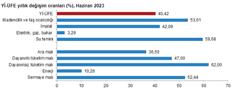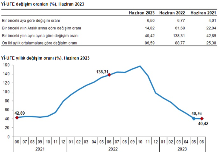 Yİ-ÜFE (2003=100) 2023 yılı Haziran ayında bir evvelki aya nazaran %6,50, bir evvelki yılın Aralık ayına nazaran %14,82, bir evvelki yılın tıpkı ayına nazaran %40,42 ve on iki aylık ortalamalara nazaran %86,59 artış gösterdi.
