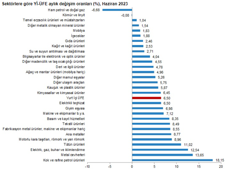 Yıllık en yüksek azalış; %19,99 ile kok ve rafine petrol eserleri, %3,66 ile ham petrol ve doğal gaz alt kesimlerinde gerçekleşti. Buna karşılık öbür madencilik ve taş ocakçılığı eserleri %95,38, temel eczacılık eserleri ve müstahzarları %91,80, içecekler %81,97 ile endekslerin en fazla arttığı alt dallar oldu.