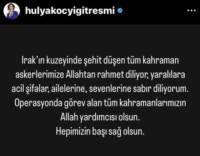 Irak’ın kuzeyinde şehit düşen tüm kahraman askerlerimize Allah’tan rahmet diliyor, yaralılara acil şifalar, ailelerine, sevenlerine sabır diliyorum. Operasyonda misyon alan tüm kahramanlarınızın Allah, yardımcısı olsun.