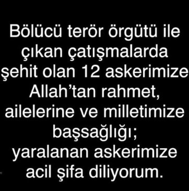Milli Savunma Bakanlığı, Irak’ın kuzeyinde bölücü terör örgütü mensupları tarafından yapılan atak ve akabinde yaşanan çatışmada 12 askerin şehit olduğunu duyurdu. Acı haber sonrası ünlü isimlerden peş peşe taziye bildirileri geldi.