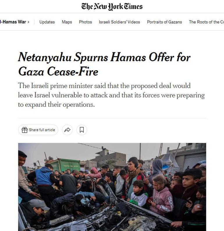 ABD’nin önde gelen gazetelerinden New York Times ‘İsrail Başbakanı Binyamin Netanyahu, Gazze Şeridi’nde ateşkesin yakın olabileceği istikametindeki umutları boşa çıkararak, Çarşamba günü Hamas’ın teklifini reddetti’ değerlendirmesinde bulundu.