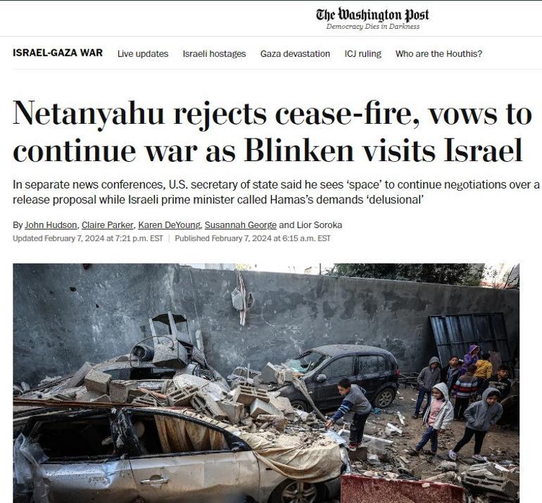 Bir öteki ABD’li gazete Washington Post ‘Netanyahu ateşkesi reddetti ve Blinken İsrail’i ziyaret ederken savaşı sürdürme kelamı verdi’ manşetini attı.
