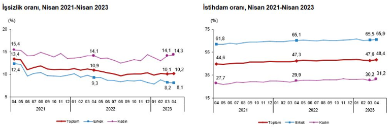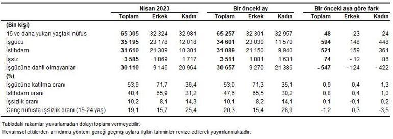 Hanehalkı İşgücü Araştırması sonuçlarına nazaran; 15 ve daha üst yaştaki bireylerde işsiz sayısı 2023 yılı Nisan ayında bir evvelki aya nazaran 74 bin kişi artarak 3 milyon 585 bin kişi oldu. İşsizlik oranı ise 0,1 puan artarak %10,2 düzeyinde gerçekleşti. İşsizlik oranı erkeklerde %8,1 iken bayanlarda %14,3 olarak kestirim edildi.