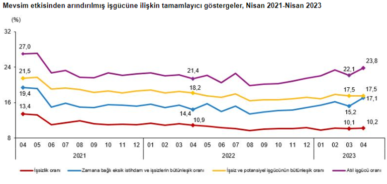 Zamana bağlı eksik istihdam, potansiyel işgücü ve işsizlerden oluşan atıl işgücü oranı 2023 yılı Nisan ayında bir evvelki aya nazaran 1,7 puanlık artış ile %23,8 oldu. Vakte bağlı eksik istihdam ve işsizlerin bütünleşik oranı %17,1 iken işsiz ve potansiyel işgücünün bütünleşik oranı %17,5 olarak iddia edildi.