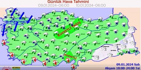 Yapılan son değerlendirmelere nazaran; yurdun batı bölümlerinde görülecek yağışların, Muğla ve Çanakkale etrafları, İzmir ve Manisa’nın kuzey ve batı, Balıkesir’in güney ve batı ile Aydın’ın kıyı ilçelerinde kuvvetli (21-50 kg/m2), Muğla’nın kıyı bölümlerinde yer yer çok kuvvetli (51-75 kg/m2) olması bekleniyor. Ekseriyetle sağanak ve gök gürültülü sağanak, akşam saatlerinden sonra sıcaklıkların düşmesiyle birlikte Manisa ve Balıkesir’in yüksek kısımlarında (1000 m üzeri) ve Çanakkale’de karla karışık yağmur ve kar halinde beklenen kuvvetli yağışların sebep olacağı sel, su baskını, yıldırım, kıyı kısımlarda hortum riski ve lokal dolu yağışı, kar yağışı beklenen bölgenin kuzey ve iç kesitlerinde kuvvetli rüzgar ile birlikte tipi üzere aksiliklere karşı dikkatli ve önlemli olunması gerekmektedir.