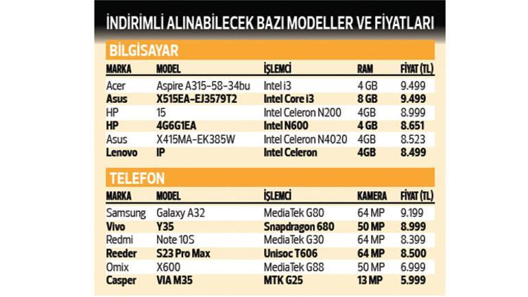 Örneğin, akıllı telefonlarda Samsung’un Galaxy serisinden A04e, A54 5G, A14, A04s, A32, A23, M14 5G ve M13 modelleri kapsama giriyor. Xiaomi Redmi serisinden 9C, 9T, 10 2020, 10C, 12C, Note 10S, Note 11, Note 12 ve 12 modeller de kriterleri karşılıyor. Tekrar Reeder, Vivo, Casper, General Mobile üzere markaların da 9 bin 500 TL’yi geçmeyen modelleri bulunuyor. Bilgisayar tarafında ise işlemcisi ve RAM’i güçlü olmayan ‘notebook’ olarak bilinen giriş düzeyi dizüstü aygıtlar bulunuyor. Lenovo IP, HP 15, Casper C370.4020-4C00B, Hometech Alfa 620 C üzere dizüstü bilgisayarlar 9 bin 500 TL hududu aşmıyor.