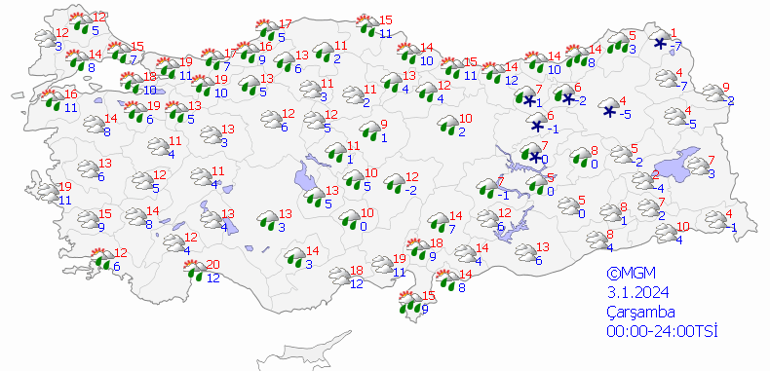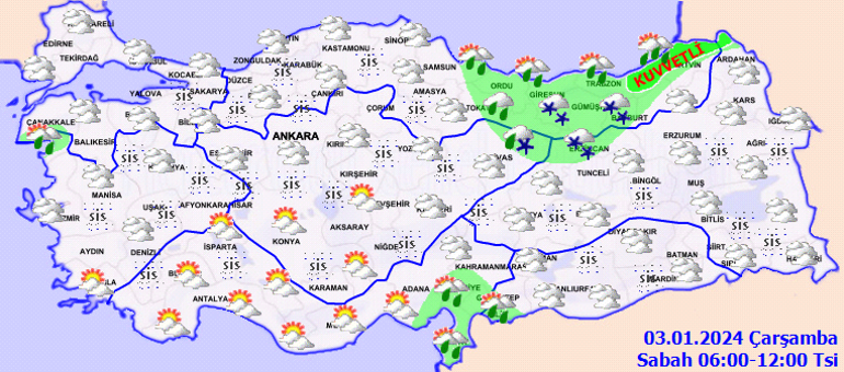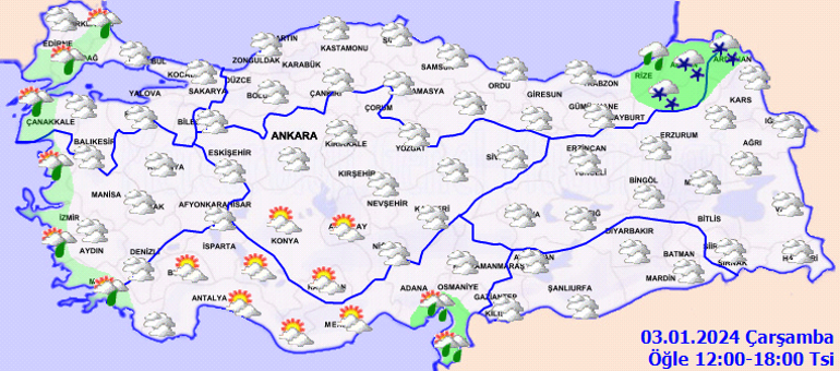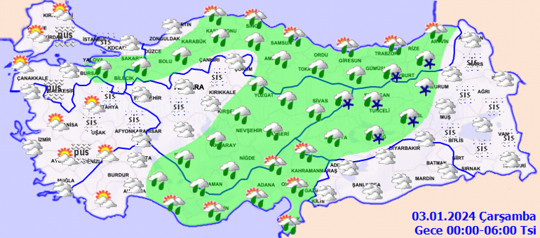 Meteoroloji Genel Müdürlüğü tarafından yapılan son değerlendirmelere nazaran, ülkemiz genelinin kesimli ve çok bulutlu, Marmara’nın güney ve doğusu, Ege, Akdeniz, İç Anadolu, Karadeniz, Doğu Anadolu’nun kuzey ve batısı ile Kilis etraflarının yağışlı geçeceği varsayım ediliyor. Çoklukla yağmur ve sağanak biçiminde görülecek yağışların Doğu Karadeniz’in iç kesitleri ve Doğu Anadolu’nun yükseklerinde karla karışık yağmur ve kar biçiminde olması bekleniyor. Rize ve Artvin etraflarında beklenen yağışların sabah saatlerinde yer yer kuvvetli olması bekleniyor. Gece ve sabah saatlerinde Marmara ile iç ve doğu kesitlerde pus ve yer yer sis bekleniyor.
