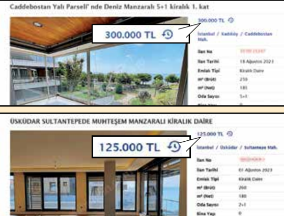* Kadıköy Caddebostan’da deniz görüntülü geniş meskenlerde kiralar 250-300 bin liraya kadar çıkıyor. 3+1,4+1 meskenler 60-180 bin lira bandında. Bölgede en ucuz kira 25 bin lira, 30 yaş üstü 2+1 daire. Fenerbahçe’de ilanda en yüksek kira 180 bin lira olurken, yüklü bedeller 50-120 bin lira bandında. Göztepe Mahallesi’nde lüks bir sitede 4+1 konutlar için istenen kira 145-155 bin lira. 2+1, 3+1 yeni ve uygun bir sitede konut kiralamak istiyorsanız 60-130 bin bandında aylık ödeme yapmanız gerekecek. Suadiye’de kıyıya yakın 4+1 konutun kirası 200 bin lirayı aşıyor. En ucuz 4+1 ilanı 65 bin lira, o da epey eski bir bina. Mütevazı bir 2+1 mesken için dahi 30-50 bin lirayı ödemeniz gerekecek.