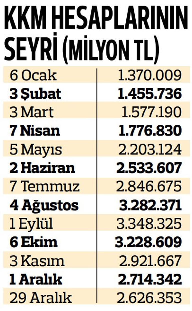 Şubat ayının başında 1.4 trilyon lira olan KKM hesapları mart ayının başında 1.6 trilyon lira, nisan ayının başında ise 1.7 trilyon düzeyine yükseldi. Bankacılık Düzenleme ve Denetleme Kurumu’nun (BDDK) bilgilerine nazaran 5 Mayıs haftasında KKM hesapları 2.2 trilyon, 2 Haziran haftasında 2.5 trilyon, 7 Temmuz haftasında 2.8 trilyon lira ve 4 Ağustos haftasında 3.3 trilyon liraya geldi. Zirve noktası ise 18 Ağustos tarihli haftada 3.4 trilyon lira oldu.