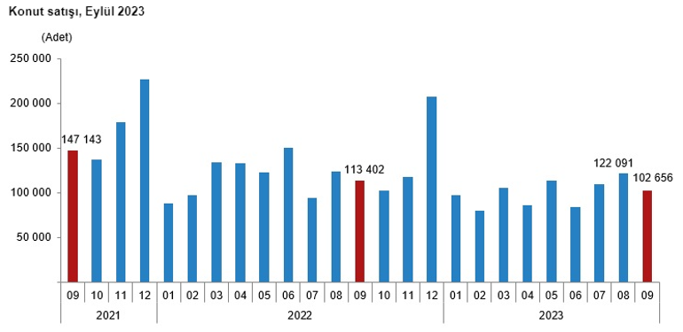 Türkiye genelinde konut satışları Eylül ayında bir evvelki yılın tıpkı ayına nazaran %9,5 azalarak 102 bin 656 oldu. Konut satışlarında İstanbul 15 bin 247 konut satışı ve %14,9 ile en yüksek hisseye sahip oldu. Satış sayılarına nazaran İstanbul’u 9 bin 48 konut satışı ve %8,8 hisse ile Ankara, 5 bin 476 konut satışı ve %5,3 hisse ile İzmir izledi. Konut satış sayısının en az olduğu vilayetler sırasıyla 47 konut ile Ardahan, 55 konut ile Hakkari ve 77 konut ile Bayburt oldu.