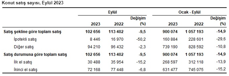 Konut satışları Ocak-Eylül periyodunda bir evvelki yılın tıpkı devrine nazaran %14,9 azalışla 900 bin 74 olarak gerçekleşti.