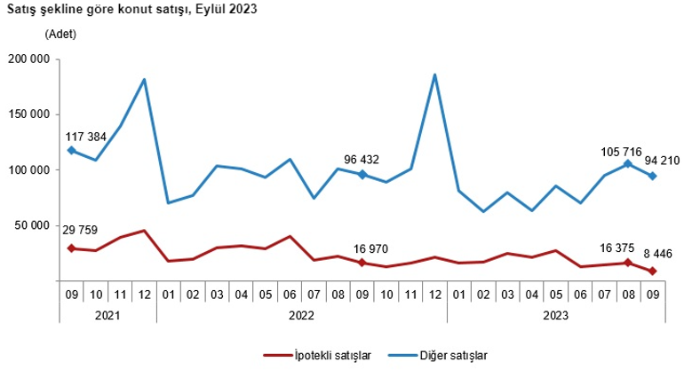 Türkiye genelinde başka konut satışları Eylül ayında bir evvelki yılın tıpkı ayına nazaran %2,3 azalarak 94 bin 210 oldu. Toplam konut satışları içinde öteki satışların hissesi %91,8 olarak gerçekleşti. Ocak-Eylül devrinde gerçekleşen başka konut satışları ise bir evvelki yılın birebir periyoduna nazaran %10,8 azalışla 739 bin 190 oldu.