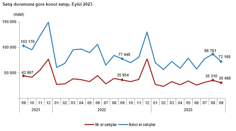 Türkiye genelinde birinci el konut satış sayısı, Eylül ayında bir evvelki yılın birebir ayına nazaran %15,2 azalarak 30 bin 488 oldu. Toplam konut satışları içinde birinci el konut satışının hissesi %29,7 oldu. Birinci el konut satışları Ocak-Eylül periyodunda ise bir evvelki yılın tıpkı devrine nazaran %13,9 azalışla 268 bin 597 olarak gerçekleşti.