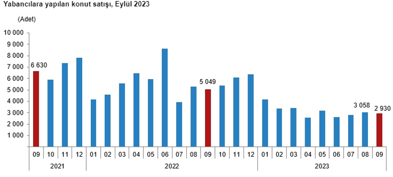 Yabancılara yapılan konut satışları Ocak-Eylül periyodunda ise bir evvelki yılın birebir periyoduna nazaran %43,5 azalarak 28 bin 64 oldu.