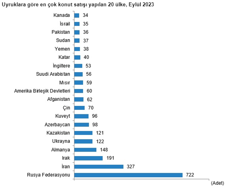 Eylül ayında Rusya Federasyonu vatandaşları Türkiye’den 722 konut satın aldı. Rusya Federasyonu vatandaşlarını sırasıyla 327 konut ile İran, 191 konut ile Irak ve 148 konut ile Almanya vatandaşları izledi.
