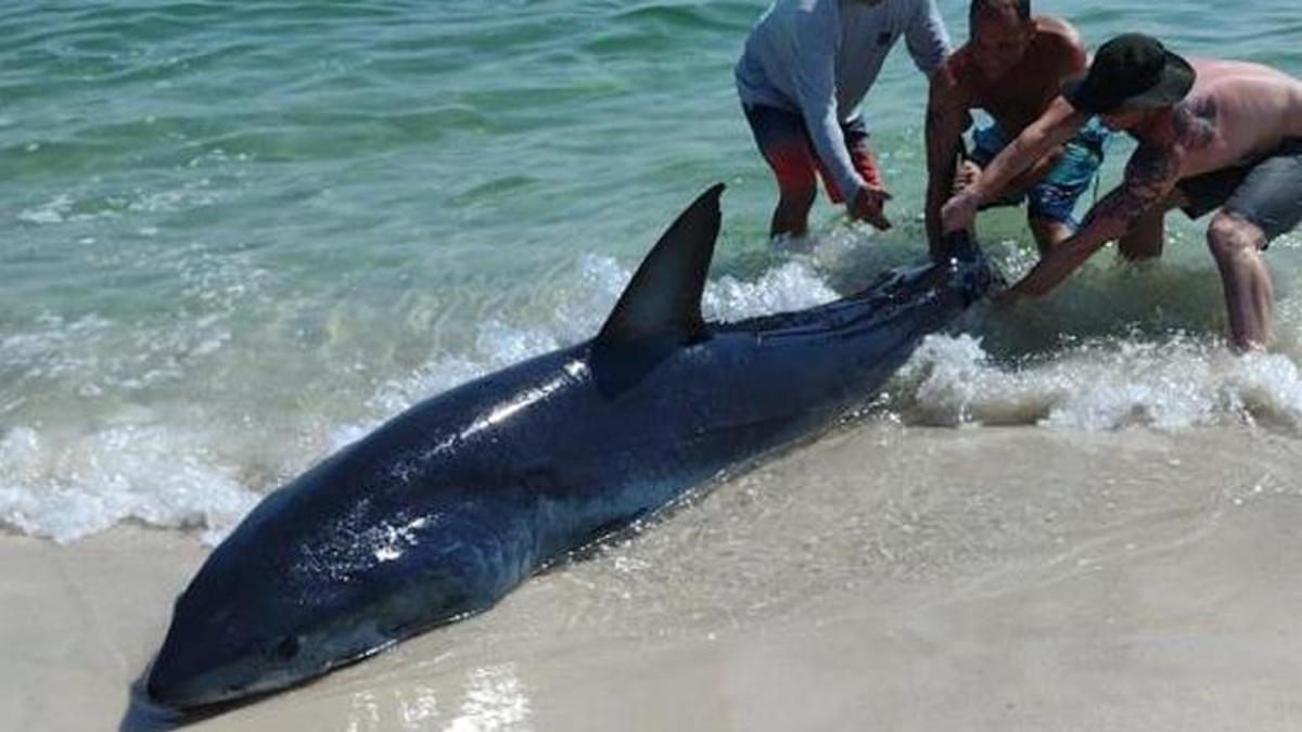 Dört kişi kumsalda mahsur kalan köpekbalığını hiçbir tedbir almadan okyanusa çekmeye çalıştı.