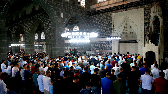 Diyarbakır’ın merkez Sur ilçesinde İslam aleminin 5. Harem-i Şerifi olarak bilinen Ulu Cami’de vatandaşlar, bayram namazı için saf tuttu.