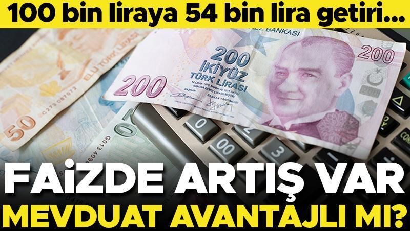 100 bin lirasını 1 aylık vadeli mevduata yüzde 44.21 oranında faizle yatıran mudi ay sonunda 3684 lira, yıl sonunda ise anapara+faiz yenilemeleriyle birlikte 54 bin 365 lira getiri sağlıyor.