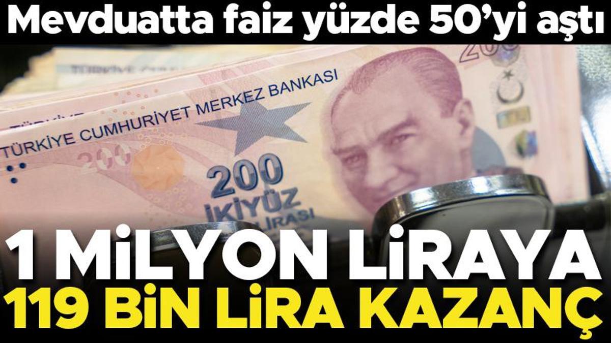 1 milyon lirası olan bir kişi yüzde 50.49 faizle 3 aylık mevduata parasını yatırdığında 119 bin 700 lira faiz getirisi elde ediyor.