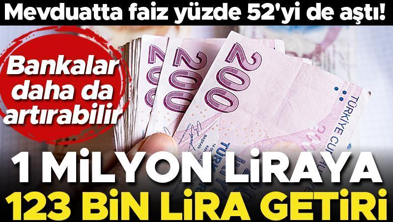 Son datalar ışığında bankalar 3 aylık mevduat faizine yüzde 52,17’ye varan faiz verdi. Böylelikle 100 bin lirası olan birisi 3 aylık vadede 12 bin 369 lira, 500 bin lirası olan 61 bin 845 lira, 1 milyon lirası olan ise 123 bin 690 lira faiz geliri elde edebilecek.