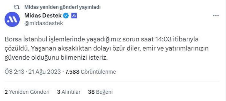 Sorunla ilgili gelen açıklamanın devamında ise “ Borsa İstanbul süreçlerinde yaşadığımız sorun saat 14:03 prestijiyle çözüldü. Yaşanan aksaklıktan ötürü özür diler, buyruk ve yatırımlarınızın inançta olduğunu bilmenizi isteriz.” denildi.