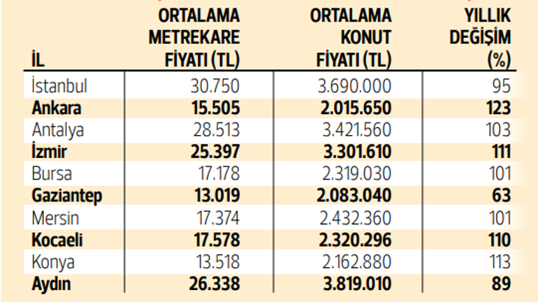 Haziran ayında toplam 83 bin 636 konut satıldı. İSTANBUL 13 bin 578 konut satışı ve yüzde 16 ile en yüksek hisseye sahip oldu. Satış sayılarına nazaran İstanbul’u 7 bin 325 konut satışı ve yüzde 9 hisse ile Ankara, 4 bin 503 konut satışı ve yüzde 5 hisse ile Antalya izledi. Araştırma sonuçlarına nazaran haziran ayı sonu prestiji ile İstanbul’da konut satış fiyatlarında yıllık paha artışı yüzde 95, ortalama konut metrekare satış fiyatı 30 bin 750 TL, ortalama konut fiyatı 3 milyon 960 bin TL oldu. Ankara’da konut fiyatları son bir yılda yüzde 123 artış gösterirken, ortalama konut metrekare satış fiyatı 15 bin 505 TL’ye, ortalama konut fiyatı 2 milyon 15 bin 650 TL’ye çıktı. Zelzele sonrası ağır göç alan Ankara’da fiyat artışının İstanbul’u geçmesi dikkat çekti. Antalya’da ise yıllık paha artışı yüzde 103, ortalama konut metrekare satış fiyatı 28 bin 513 TL, ortalama konut fiyatı 3 milyon 421 bin 560 TL olarak hesaplandı.